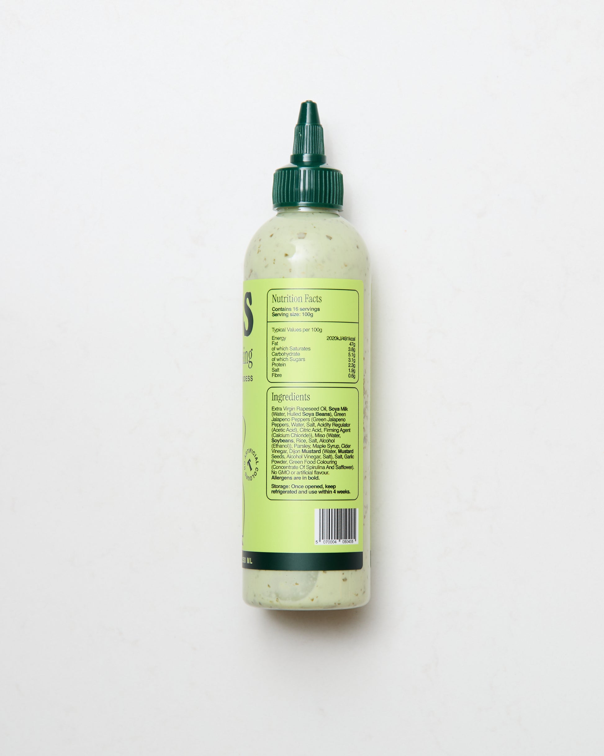 Ingredients: Extra Virgin Rapeseed Oil, Soya Milk (Water, Hulled Soya Beans), Green Jalapeno Peppers (Green Jalapeno Peppers, Water, Salt, Acidity Regulator (Acetic Acid), CitricAcid, Firming Agent (Calcium Chloride)), Miso (Water, Soybeans, Rice, Salt, Alcohol